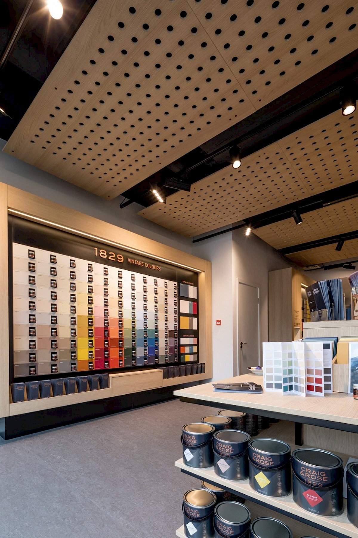 We’re particularly proud of the advancements in the paint shelving display, where a need for a high weight load and robust structure initially had the team looking to use a more conventional racking method with applied cladding. Moving away from this design, enabled us to lighten the vertical structure, allowing the product to take centre stage.